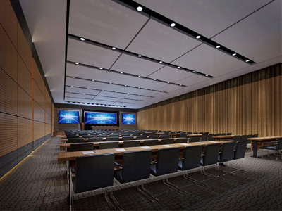 1、吸音吊頂:多功能廳頂部的施工處理主要是隔音和聲學效果處理。頂棚的吸聲面積,對整個室內的吸聲起著關鍵作用。因此處理好頂棚吸聲對整體的聲學設計至關重要。經計算分析,頂棚使用隔聲吸聲符合吊頂的聲學處理方式。燈光處采用鋁格柵吊頂,面光燈嵌入吊頂里,頂部四周采用聚酯纖維吸音板,形成美觀造型的吊頂。